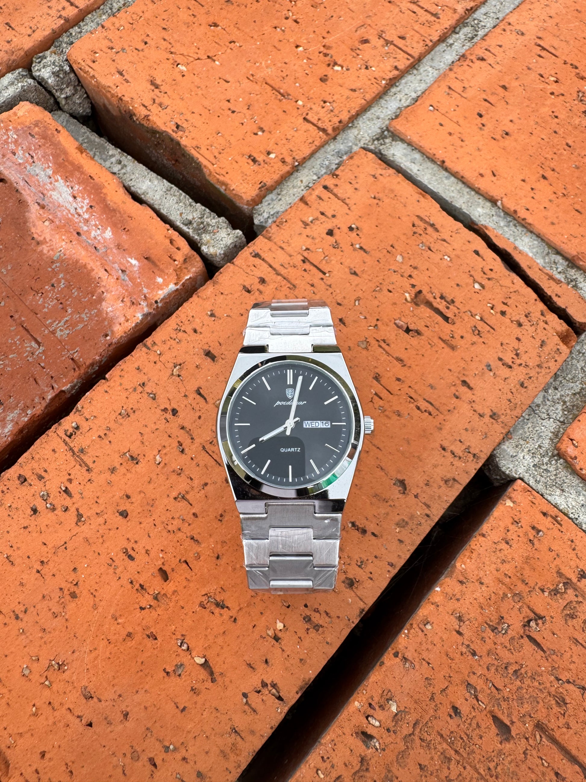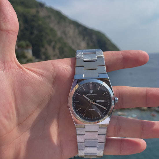 Acest ceas are un design elegant și modern, cu o carcasă si brățara metalică din oțel inoxidabil . Cadranul negru lucios oferă un contrast rafinat, completat de indicatori simpli si subțiri . Este un ceas quartz, cu afișaj de zi si dată poziționat la ora 3. Potrivit atât pentru ținute business, cât și pentru ocazii formale.